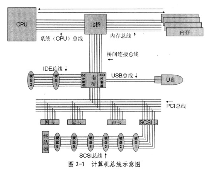 计算机组成:CPU<>I/O桥<>主储存器,I/O桥<>I/O总线接USB控制器、接图形适配器、接磁盘控制器接磁盘等