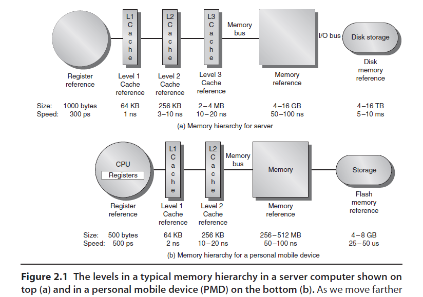 寄存器->L1高速缓存->L2高速缓存->L3高速缓存/SRAM->主存/DRAM->本地二级存储/本地磁盘->远程二级存储/云端设备等