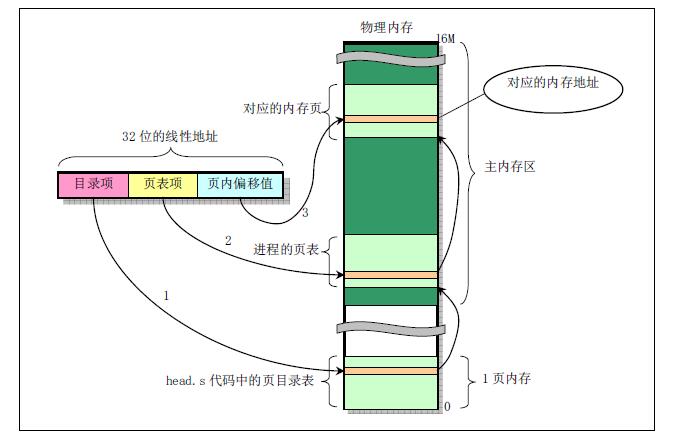 其次,使用1个页目录表+4个页表,即head.s中4个页表进行管理,即2^12(偏移)*1024(页表内偏移)*4(表数)字节=16MB。